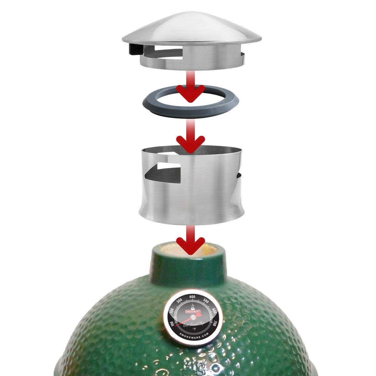 High-Temp Adapter allows the SmokeWare Stainless Steel Vented Chimney Cap to fit a Small or MiniMax Big Green Egg® as well as Kamado Joe® Junior. It can be removed for cleaning and re-used again and again. This gasket should be the perfect solution for those wanting to use a SmokeWare Cap on a smaller grill!