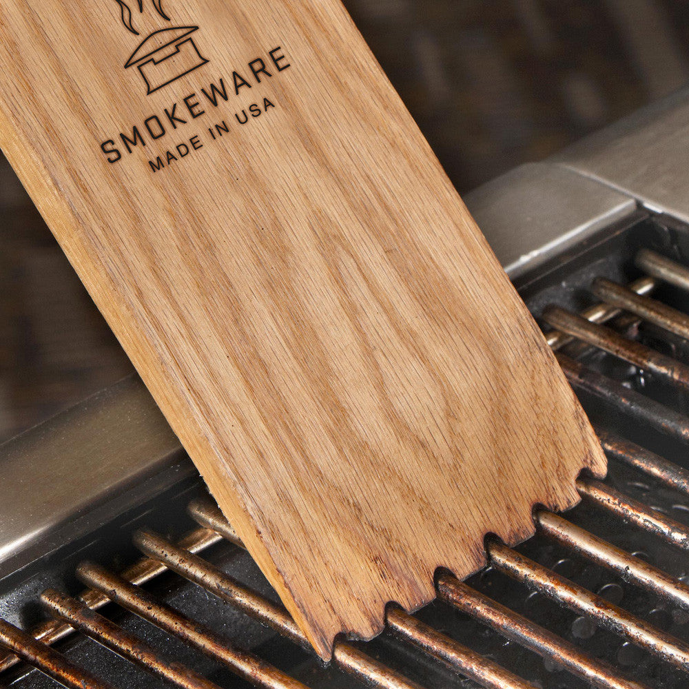 The Great Scrape® is an all natural BBQ cleaning tool.  It is an alternative to the old metal wire brush. It custom grooves to uniquely fit your grill without having to worry about metal bristles or harming your grill grates. It is made of solid hardwood and is designed for years of grilling pleasure.